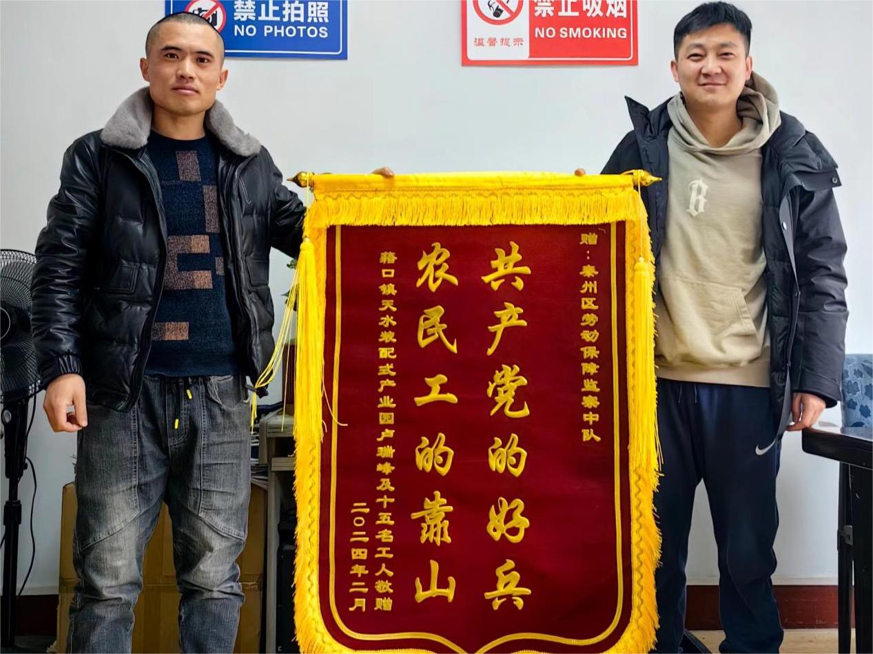 “真是太谢谢啦,我们的工资到账了,终于可以回家过年了。”2024年2月4日被拖欠工资农民工代表来到秦州区劳动保障监察中队,送来一面书写有“共产党的好兵、农民工的靠山”的锦旗,真诚对各位监察员表达了诚挚的谢意。