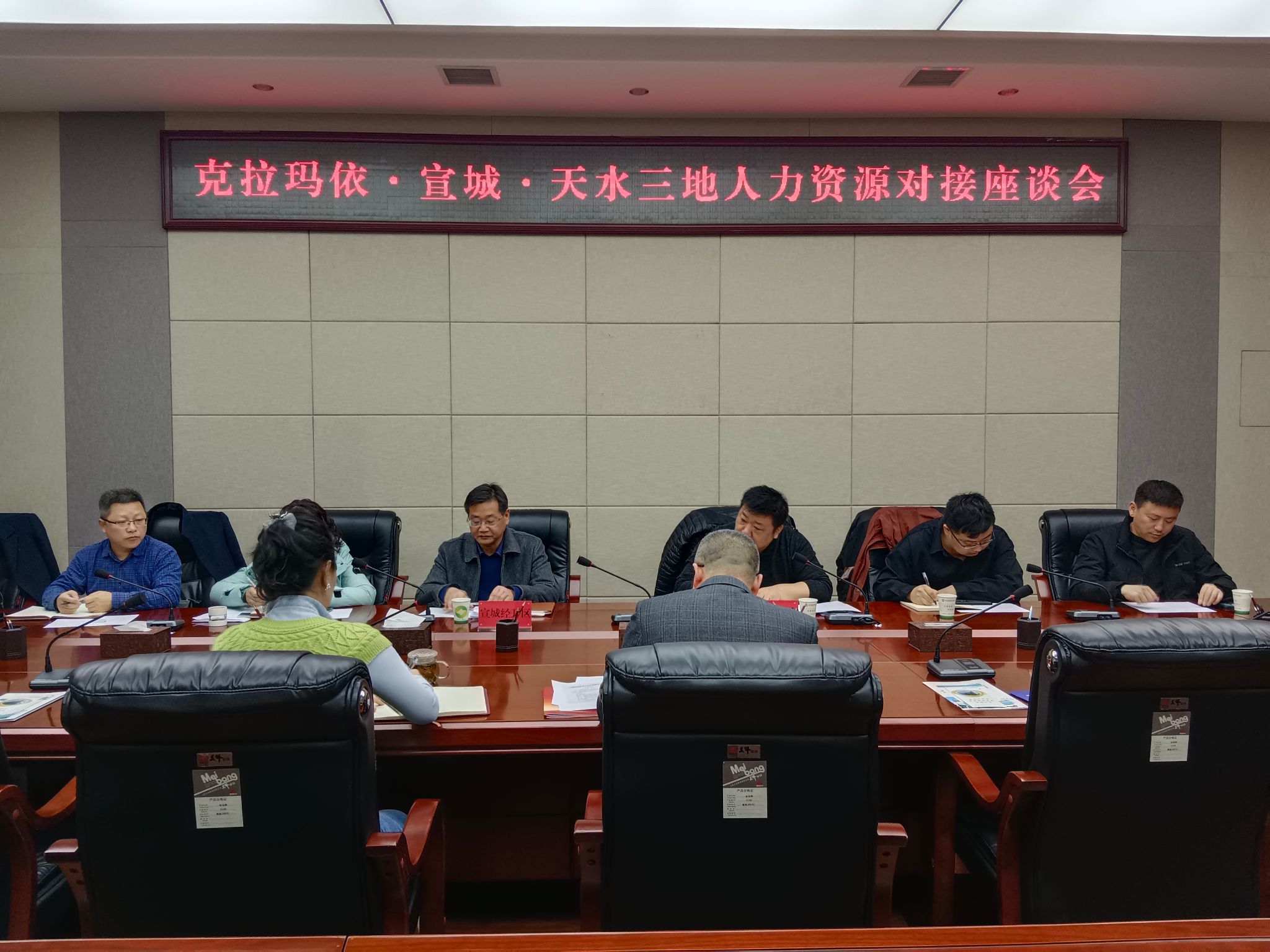 招聘会当天,新疆克拉玛依、安徽宣城、甘肃天水三地人社部门召开座谈会,就积极推进新甘协作、中西部协作,加强就业支持、人才交流,携手合作发展展开热烈讨论。三地间通过搭建互助交流平台,构建人力资源对接机制,助力引导我市中高职院校毕业生和城乡劳动力在新、皖两省稳定就业,推动形成“产业均衡发展、人力资源高效配置、人才交流余缺互补”的人力资源协作新格局,三地将以此次活动为契机,积极为用工企业办实事、做好事、解难事,不断提升人力资源协作水平。