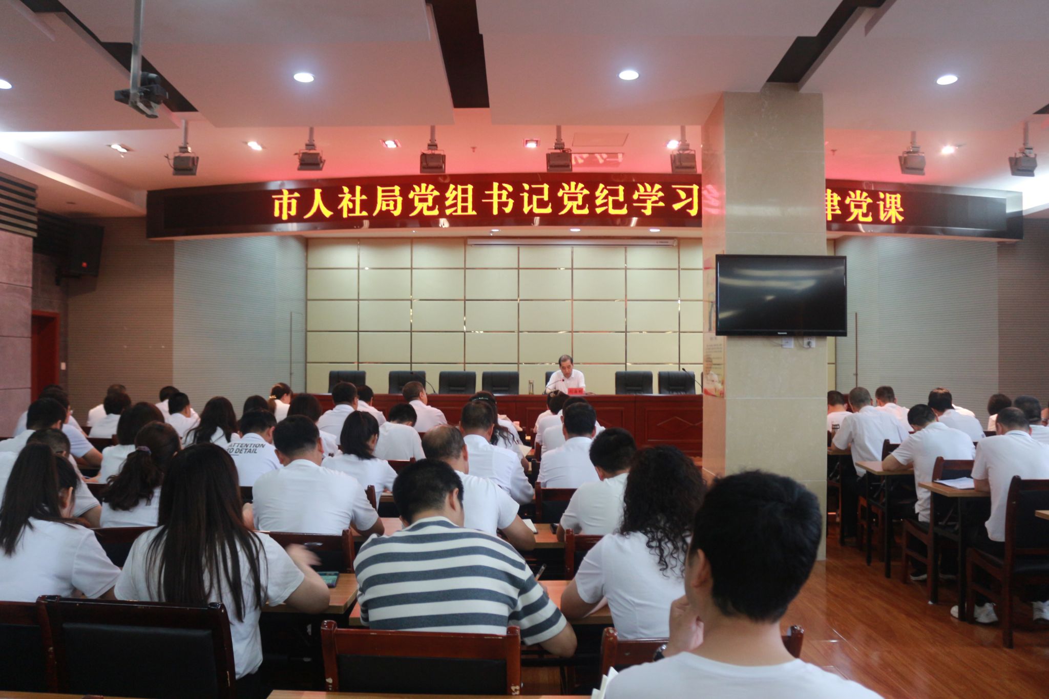 6月20日,市人社局党组书记、局长剡海明以“筑牢思想防线 严守纪律底线”为题,讲授党纪学习教育纪律党课。局班子成员、局属各单位班子成员及人社系统全体党员参加党课。