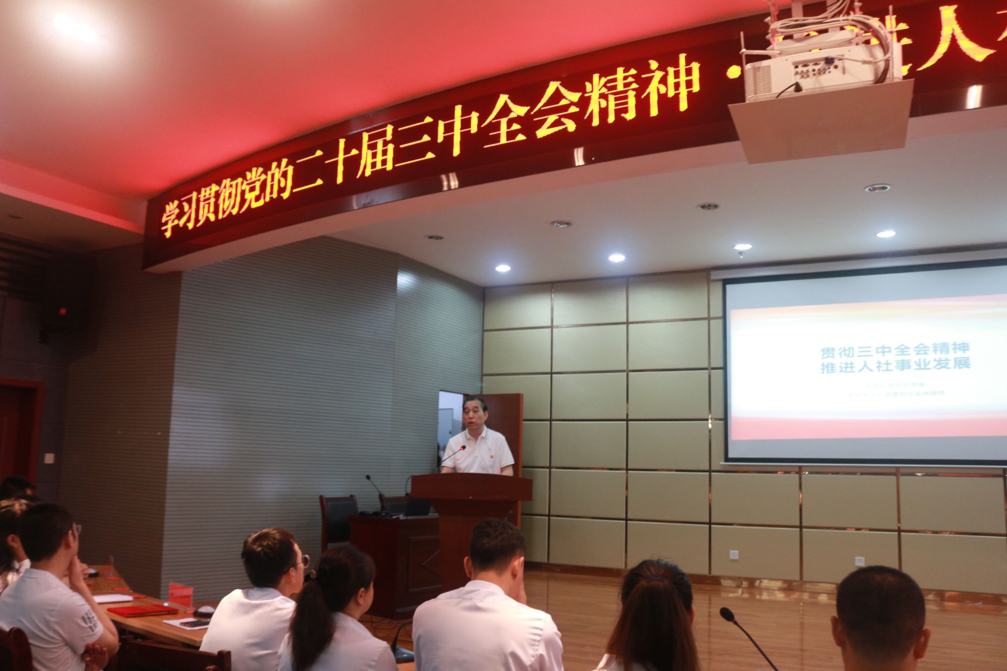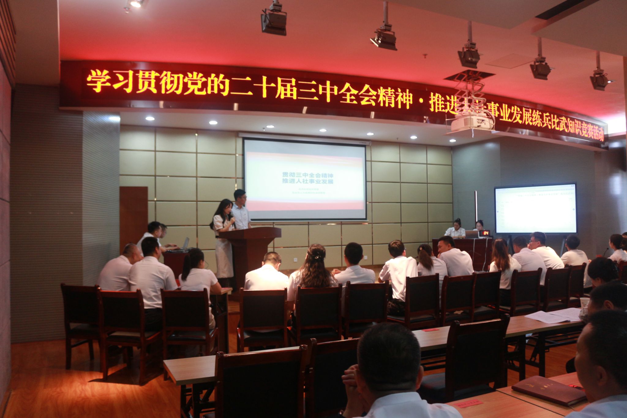 为深入贯彻落实习近平新时代中国特色社会主义思想和党的二十届三中全会精神,纵深推进党纪学习教育,7月26日上午,天水市人社局举行“贯彻党的二十届三中全会精神·推进人社事业高质量发展”练兵比武知识竞赛活动。本次知识竞赛以支部为单位分组作答、积分排名,全局7个支部21名选手参赛,分个人必答、团队共答、全队抢答三个环节,竞赛内容涵盖党的二十届三中全会精神、党建理论知识和就业创业、社会保险、人事人才、劳动维权等业务内容,重点考察人社干部职工践行初心使命、运用法规政策为民服务解难题办实事的真本事、硬功夫。