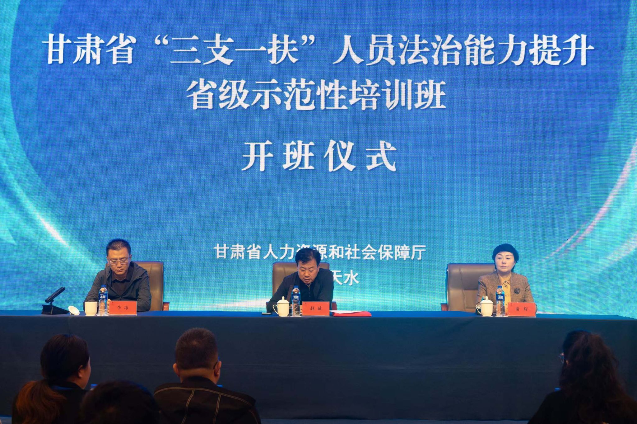 2024年10月13日上午,甘肃省“三支一扶”人员法治能力提升省级示范性培训班在天水市举行开班仪式,省高校毕业生就业办公室主任赵斌、副主任李冰出席会议并讲话,市人社局副局长谢辉致辞,相关市州带队领导、新招募“三支一扶”人员、部分在岗人员共计100余人参会。