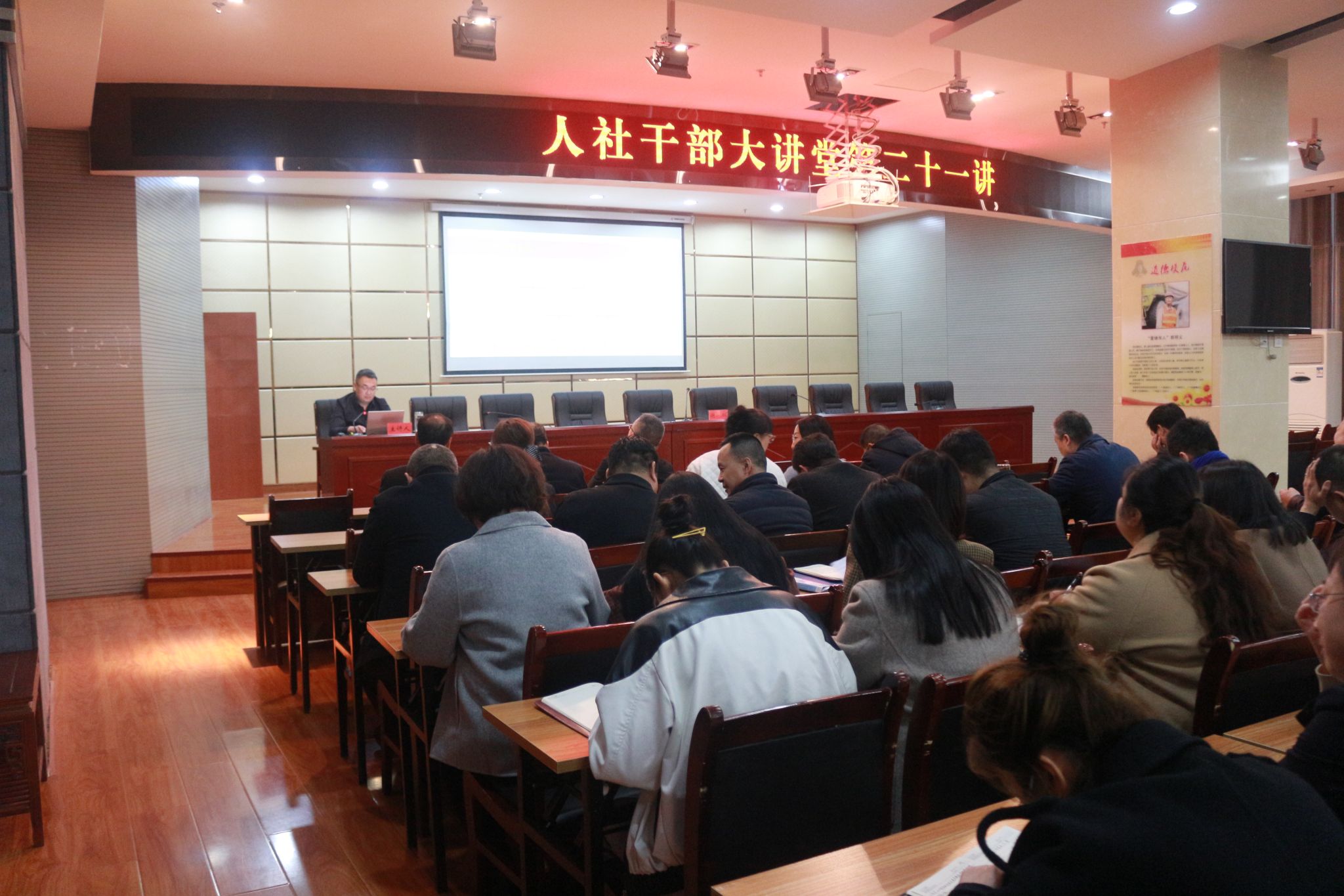 3月14日下午,天水市人社局第二十一期“人社干部讲堂”开讲。市劳动人事争议仲裁院院长刘睿以“全面推进劳动人事争议仲裁工作高质量发展”为题作专题讲解,局机关、局属各单位全体干部职工参加讲座。