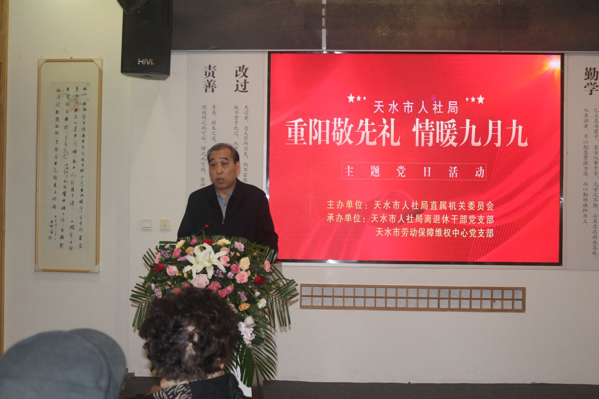 金秋送爽,丹桂飘香。在中华民族传统节日重阳节即将来临之际,为弘扬尊老敬老爱老助老的优良传统,传递党组织对离退休党员的深切关怀,10月28日上午,天水市人社局在国馥茗文化创意馆精心组织开展“重阳敬先礼·情暖九月九”主题党日活动。局领导班子成员、离退休党员代表、各支部党员代表,以及养生专家、民俗专家、太极拳师等共50余人齐聚一堂,共赴一场温情满溢的重阳之约。