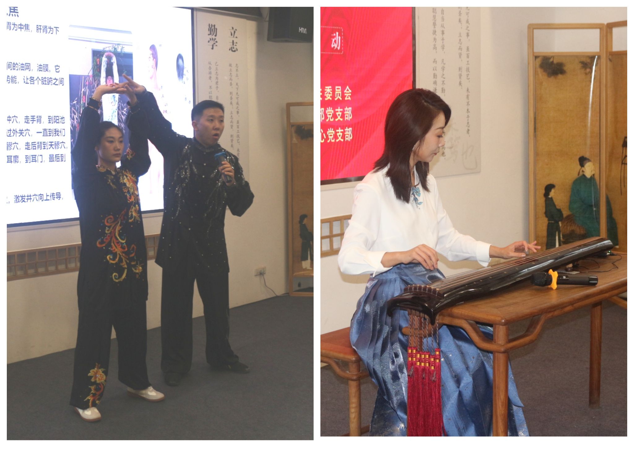 “起势、左右野马分鬃……”随着陈氏太极拳传人陈睿东的招式舒展,活动进入首个互动环节——太极拳展示与交流。二十四式太极拳刚柔相济、行云流水,既展现了传统武术的魅力,也传递着“以和为贵”的东方智慧。随后,古琴老师刘欣轻抚琴弦,《秋风词》的婉转低回依次流淌,琴音与茶香交融,将现场氛围推向静谧悠远的意境。大家闭目聆听,不少人轻声跟唱,沉浸在传统文化的深厚底蕴中。“这样的活动既有文化味,又有烟火气,让我们真切感受到了组织的用心!”离退休第二党支部党员代表苏东仓感慨道。