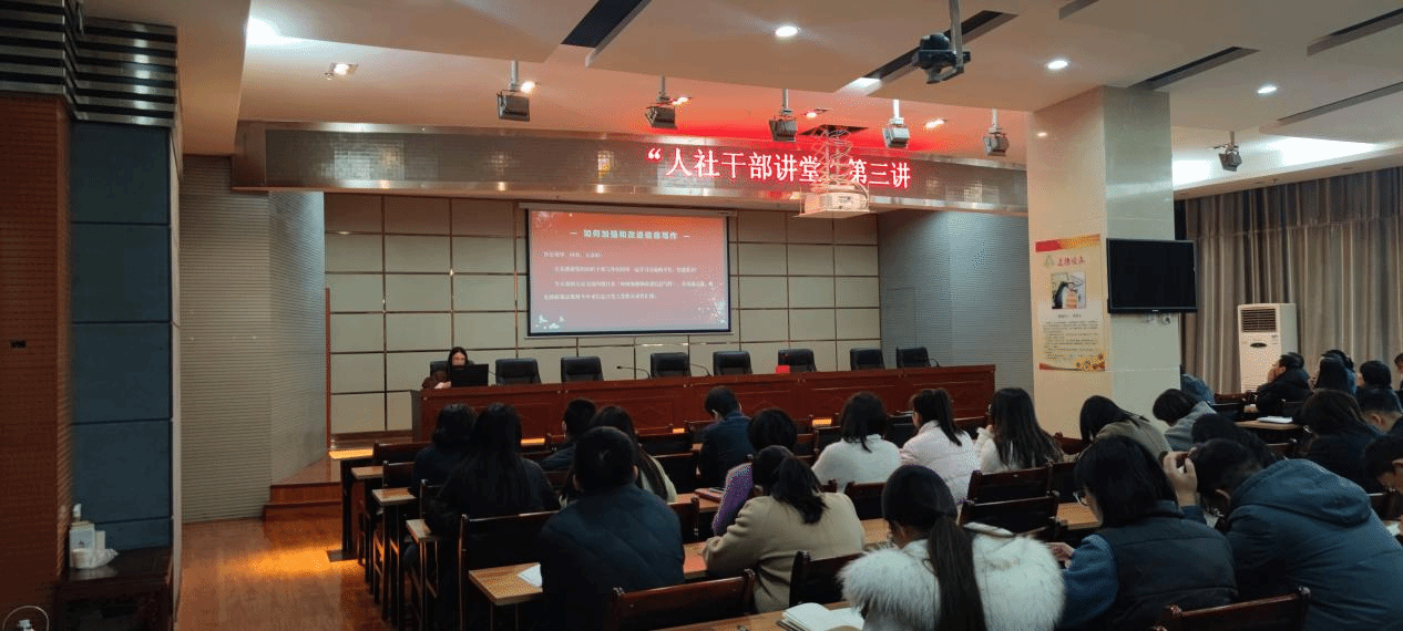 12月14日,天水市人社局第三期“人社大讲堂”开讲。政策法规科科长张玲围绕“如何加强和改进信息写作”做专题讲解,局机关、局属各单位全体干部参加讲座。