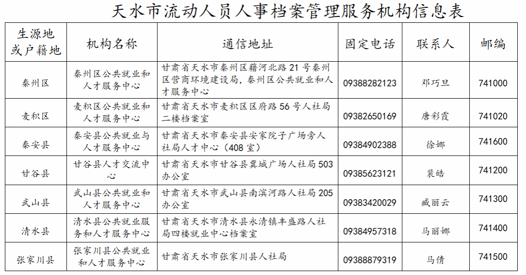 附表:《天水市流动人员人事档案管理服务机构信息表》