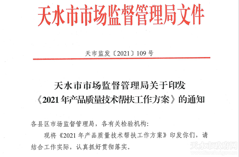 近日,天水市市场监管局制定印发了《2021年产品质量技术帮扶工作方案》,将对重点消费品生产销售等三类企业实施质量技术帮扶,切实解决产品质量领域存在的突出问题,提升企业质量管理能力和市场竞争力,推动我市产品质量总体水平全面提升。
