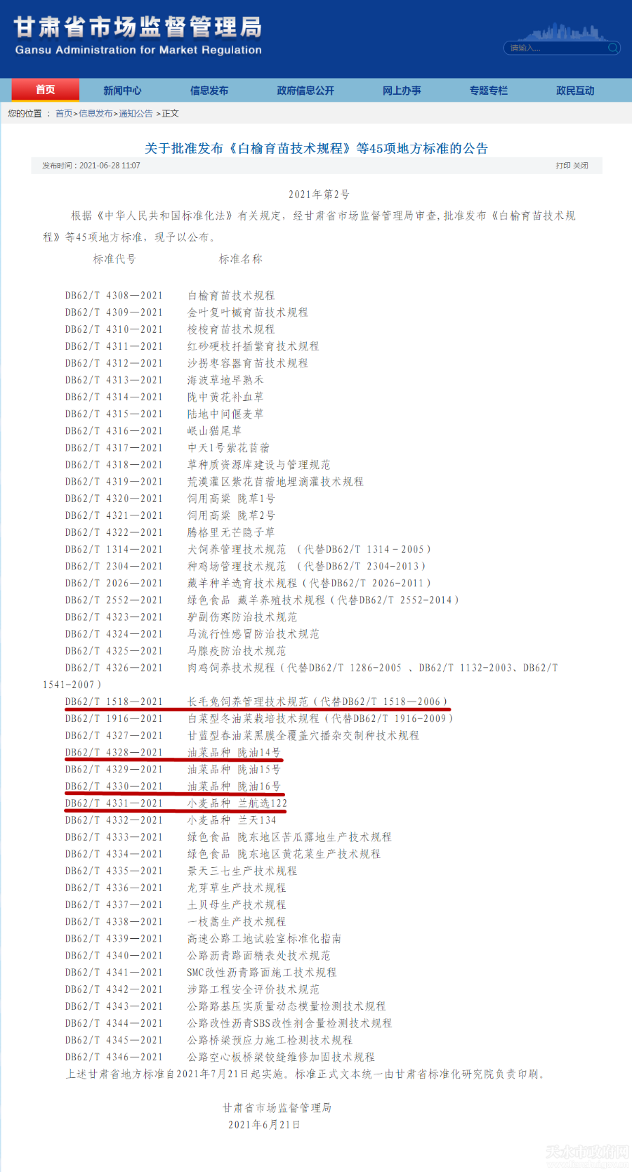 近日,甘肃省市场监管局发布了《关于批准发布< 白榆育苗技术规程>等45项地方标准的公告》,我市组织制修订的《长毛兔饲养管理技术规范》《油菜品种 陇油14号》《油菜品种 陇油16号》《小麦品种 兰航选122 》4项甘肃省地方标准获批准发布,并于2021年7月21日起实施。