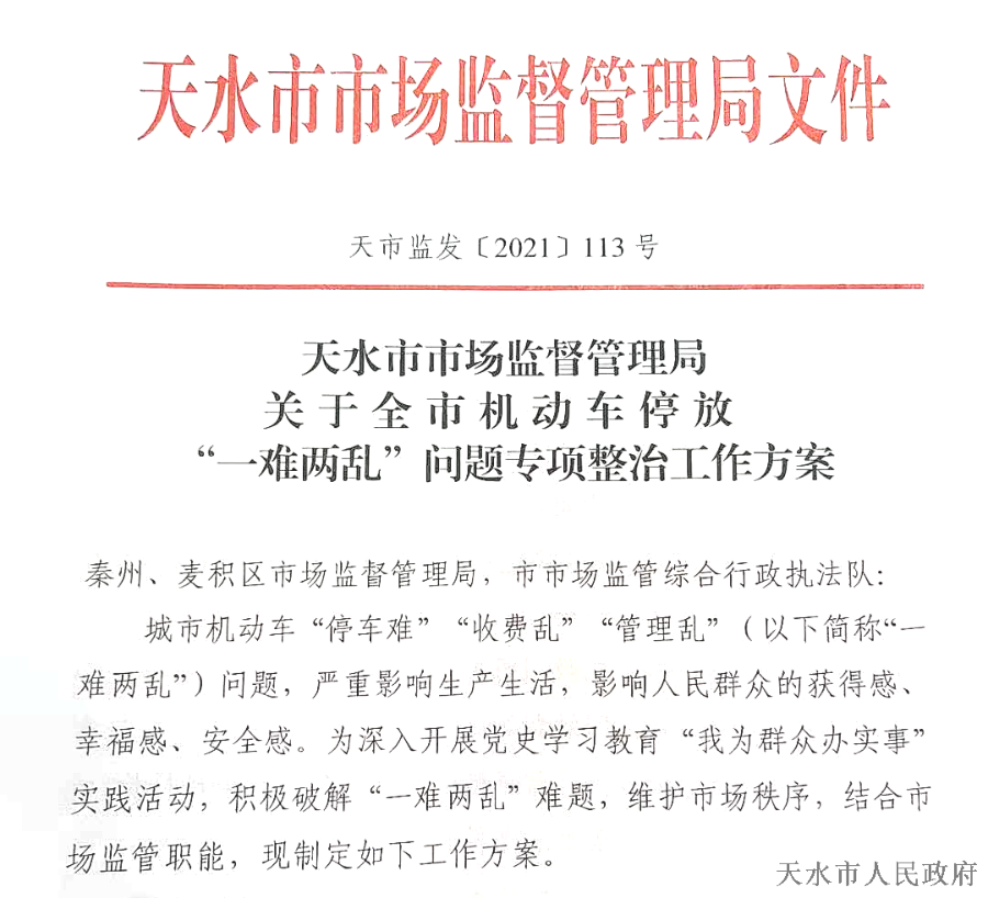 为深入开展党史学习教育“我为群众办实事”实践活动,着力解决人民群众“急难愁盼”问题,近日,天水市市场监管积极部署开展了城市机动车停放“一难两乱”(即:“停车难”“收费乱”“管理乱”)问题专项整治。