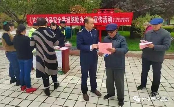 天水市局联合甘谷县局,在甘谷县赤诚国际酒店门前举行集中宣传活动。设置“12315”投诉举报热线电话,活动现场向广大群众宣传《甘肃省食品安全举报奖励办法》适用的奖励条件、奖励标准、奖励程序、监督管理及法律责任等内容,鼓励广大群众积极参与食品安全投诉举报。同时,组织各基层市场监管所在各醒目位置张贴《甘肃省食品安全举报奖励办法》,充分调动基层群众参与食品安全监督的积极性。