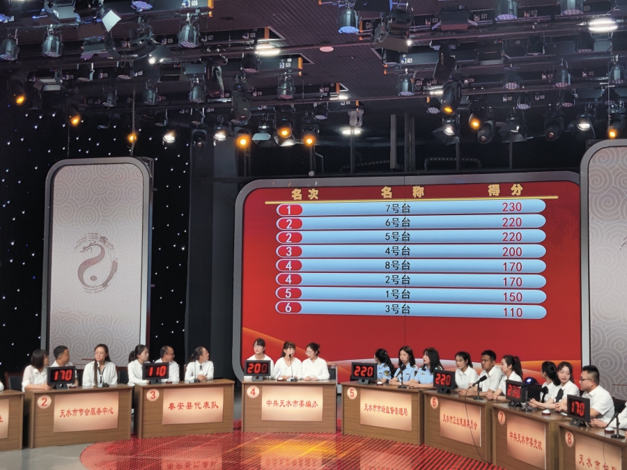 天水市伏羲文化知识竞赛总决赛共有8支代表队参赛,主要以伏羲文化基本内涵、根本要义、思想地位、精神价值等为竞赛内容。竞赛包含个人必答题、集体必答题、抢答题和风险题等环节。