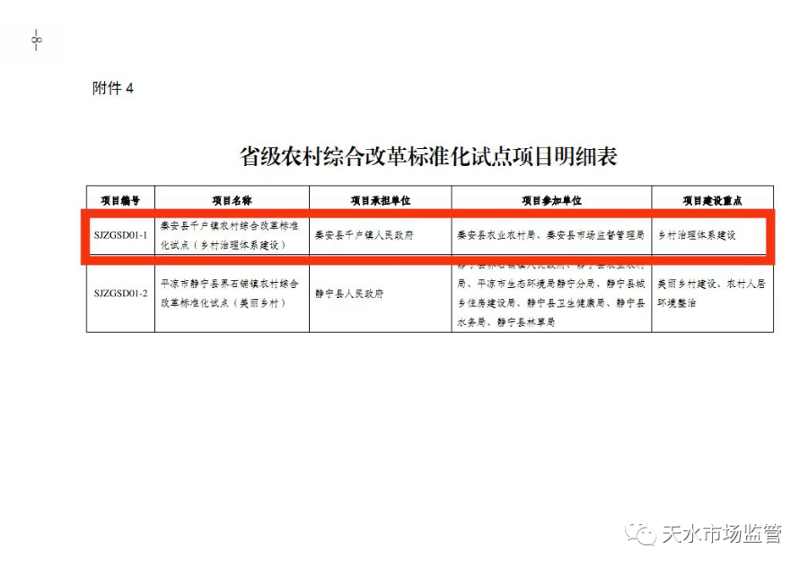 由秦安县千户镇承担的农村综合改革标准化试点项目,以“乡村治理体系建设”为建设重点,按照“产业兴旺、生态宜居、乡风文明、治理有效、生活富裕”的总要求,围绕秦安县千户镇乡村振兴和整体建设规划,坚持问题导向和发展导向,积极开展乡村治理标准体系建设,构建乡村治理标准体系框架,有效实施相关标准,为深化村民自治实践、提高农村治理水平,推进乡村治理体系和治理能力现代化提供有益探索。