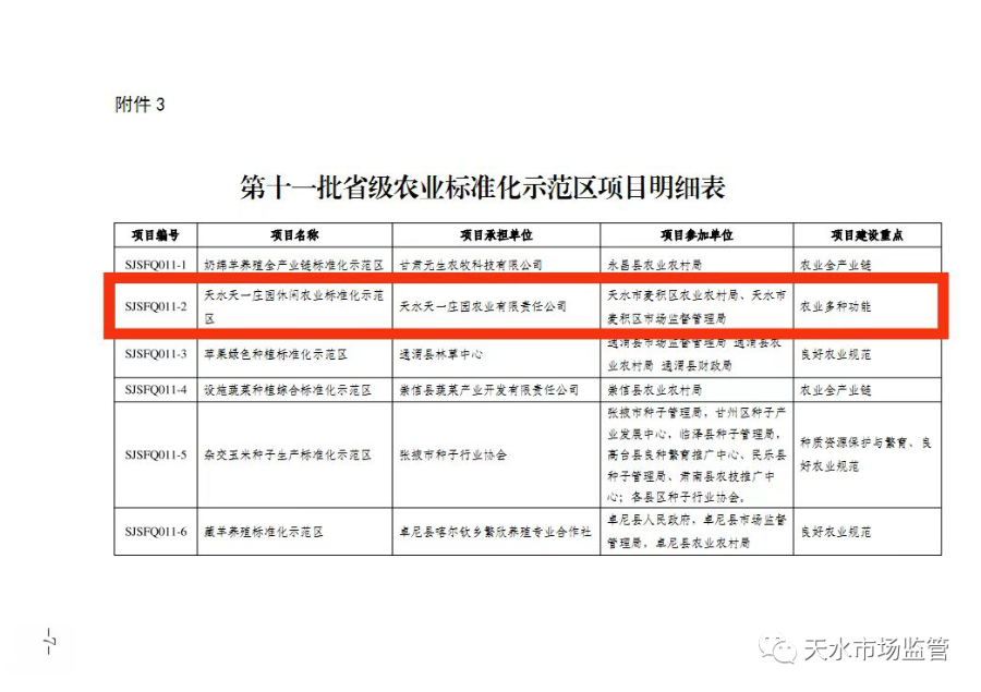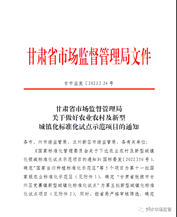 近日,省市场监督管理局下达了农业农村及新型城镇化标准化试点示范项目建设名单,由天水市市场监督管理局推荐的“天水天一庄园休闲农业标准化示范区”被确定为第十一批省级农业标准化示范区项目,“秦安县千户镇农村综合改革标准化试点(乡村治理体系建设)”被确定为省级农村综合改革标准化试点项目。2019年以来,我市新增各级各类标准化试点示范项目9个,其中农业农村领域4个。