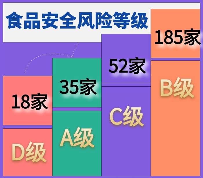 二是科学评级。按照《食品生产经营风险分级管理办法》要求,对照静态和动态风险因素量化分值两项指标,对食品安全状况良好、无违法违规行为的食品生产企业,下调风险等级;对监督抽检不合格、存在严重食品安全隐患以及故意违反食品安全法律法规受到行政处罚的企业,上调风险等级。经评定,全市食品安全风险等级A级企业35家,B级185家,C级52家,D级14家。