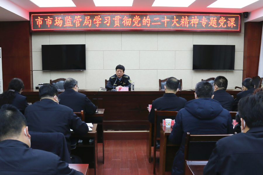 1月9日,市市场监管局举办学习贯彻党的二十大精神专题党课。党组书记、局长王宏玮作了题为“深学笃行砺初心 勇担使命促发展”的专题党课辅导。市局领导班子成员、各直属单位主要负责人及机关党员干部共80余人参加党课辅导。