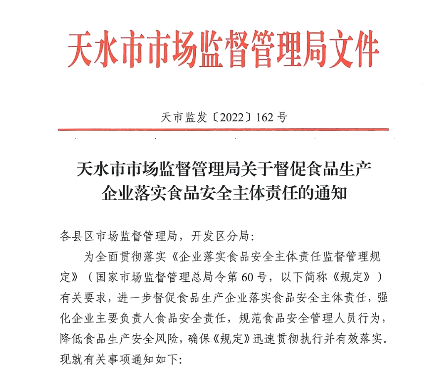 为全面贯彻落实《企业落实食品安全主体责任监督管理规定》(国家市场监督管理总局令第60号),天水市市场监督管理局研究制定了食品生产企业《风险管控清单》《每日食品安全检查记录》《每周食品安全排查治理报告》《每月食品安全调度会议纪要》等样表,并印发通知就食品生产企业落实日管控、周排查、月调度工作机制提出明确要求。