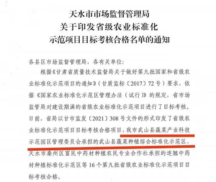 武山县蔬菜种植综合标准化示范区是第九批省级蔬菜种植综合标准化示范项目,项目实施以来,市、县市场监管部门围绕试点确定的重点方向,以促进示范试点单位优化结构、提升质量、打造品牌、促进发展为出发点,精心培育,精细指导,精准帮扶,在标准体系构建、标准制修订、采标对标达标等方面跟进服务指导。通过标准化生产和管理,推动辣椒、架豆、甘薯种植以及散养鸡养殖成为当地脱贫致富的主导产业,以产业发展带动了农民增收致富。