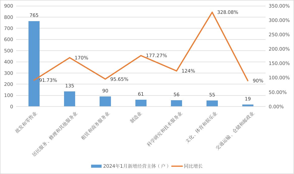 分领域看,部分行业发展势头明显,新设的经营主体中,文化、体育和娱乐业55户,同比增长328.08%;制造业61户,同比增长177.27%;居民服务、修理和其他服务业135户,同比增长170%;科学研究和技术服务业56户,同比增长124%;租赁和商务服务业90户,同比增长95.65%;批发和零售业765户,同比增长91.73%;交通运输、仓储和邮政业19户,同比增长90%。