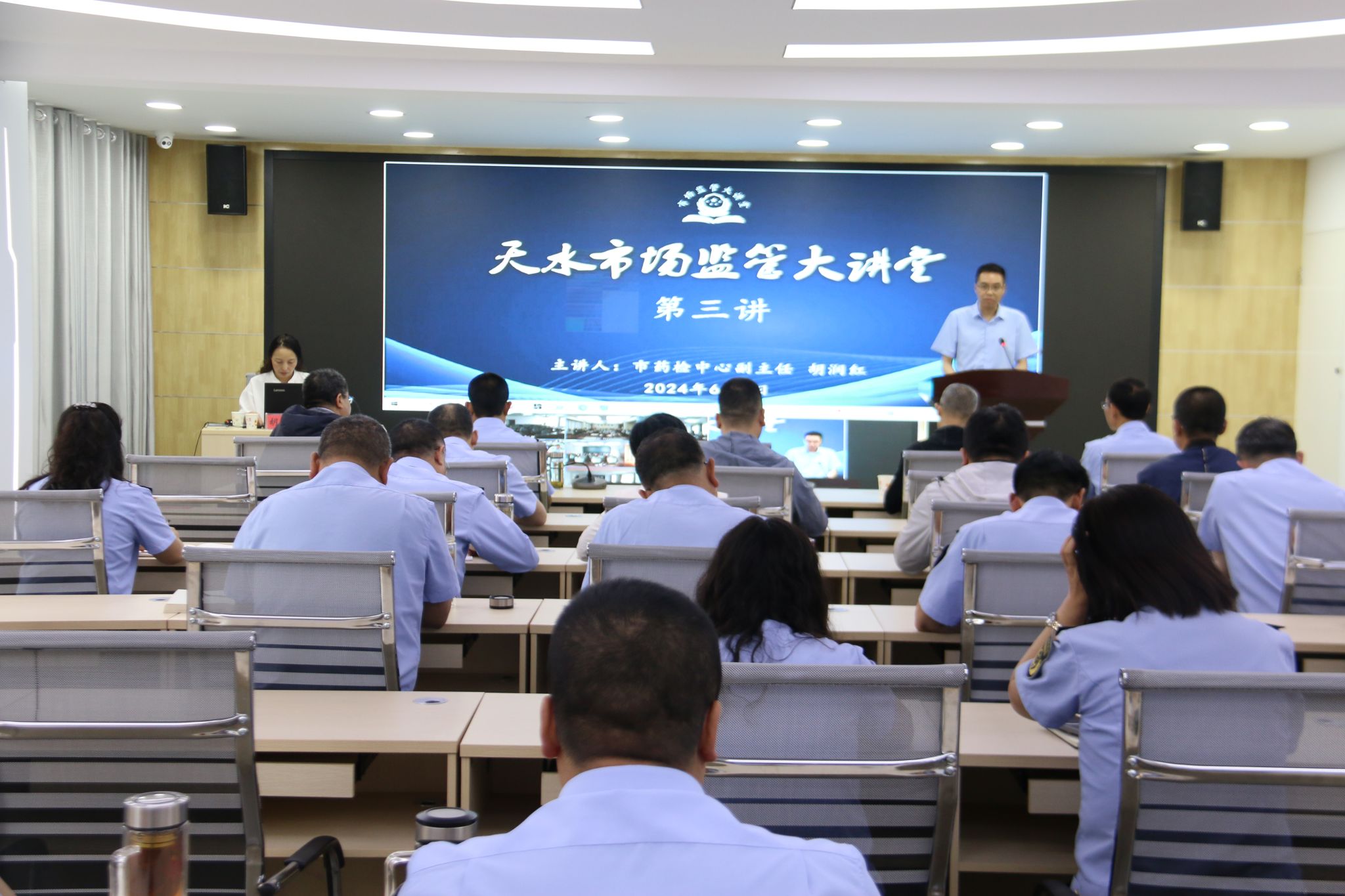 6月3日,天水市市场监管局举办2024年“市场监管大讲堂”第三讲,市药品检验检测中心副主任胡润红作了题为《加强药械安全监测保障公众用药用械安全》专题辅导。市市场监管局党组成员、副局长张志伟主持讲座,市局机关、市市场监管综合行政执法队、局属各事业单位和各县区市场监管局共600余人在主、分会场聆听了讲座。