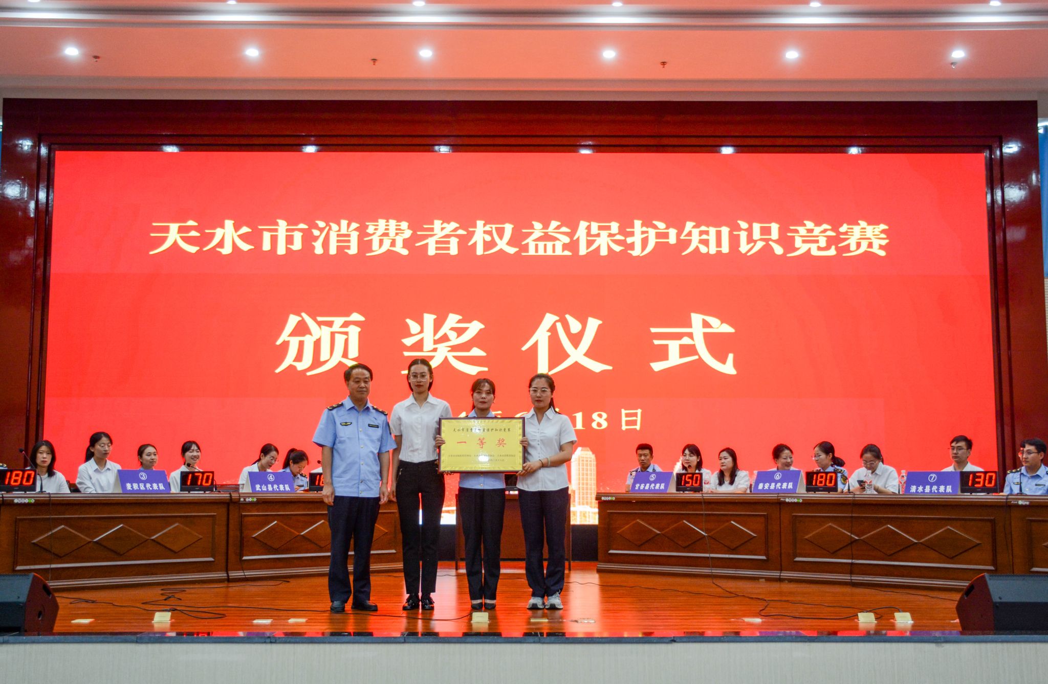 本次知识竞赛共有8支代表队参赛,参赛队员来自市场监管执法人员、企业、消费者、律师、社区工作者等多个领域,围绕《中华人民共和国消费者权益保护法》及其《实施条例》《促进个体工商户发展条例》《甘肃省消费者权益保护条例》等法律法规设置题目,经过必答题、抢答题和风险题3个环节的激烈角逐,市市场监管局代表队获得一等奖,秦州区局代表队、秦安县局代表队获二等奖,麦积区局代表队、武山县局代表队、甘谷县局代表队获三等奖,清水县局代表队、张家川县局代表队获优秀组织奖。