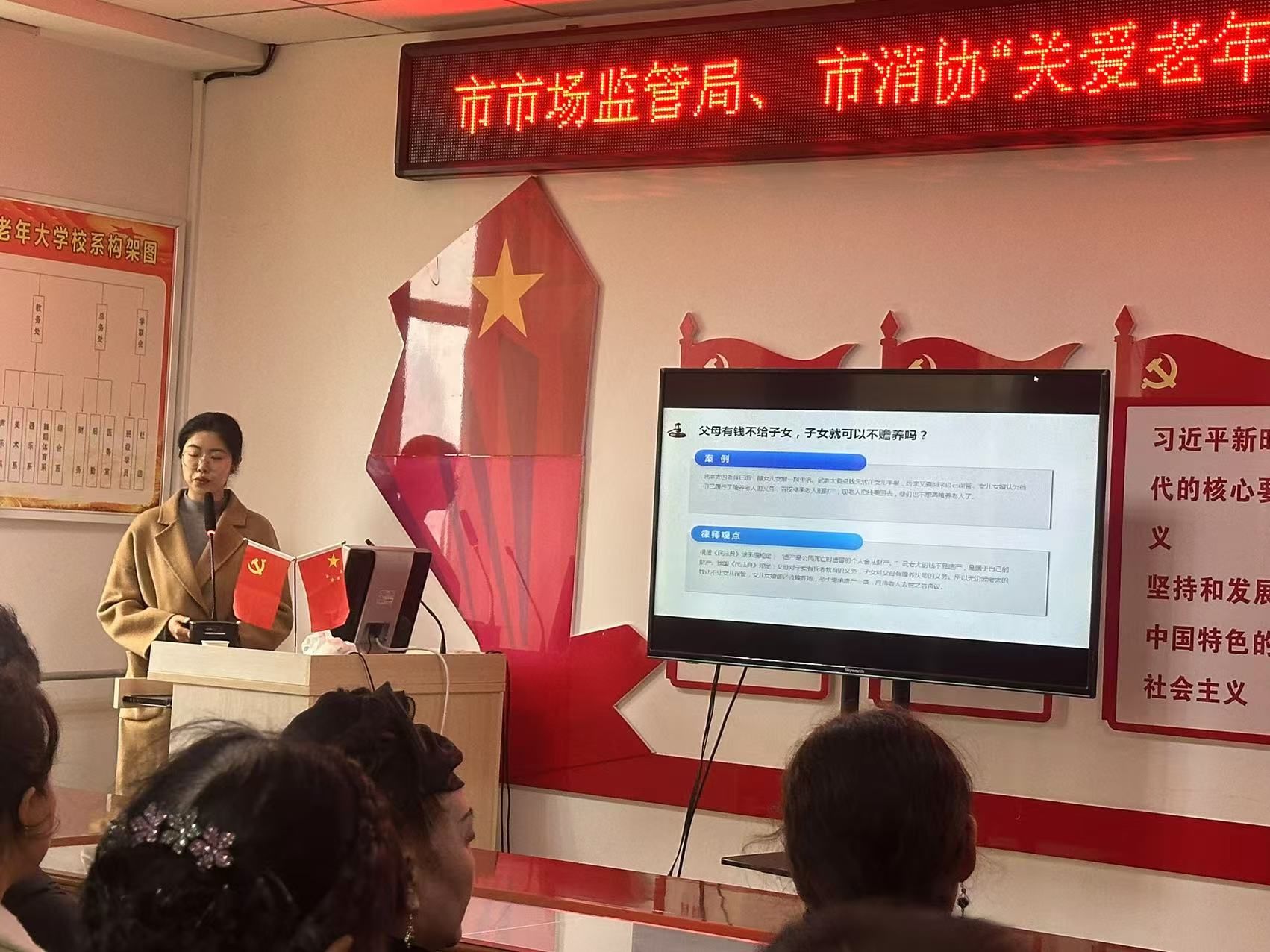 为切实维护老年人合法权益,增强老年人法律意识,11月15日,市市场监管局、市消费者协会邀请市消协理事单位天秦律师事务所王晓蕾律师,在天水市老年大学开展了普法宣讲活动。