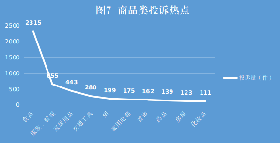 服装鞋帽类问题投诉量仅次于食品安全问题,主要投诉点为质量问题(如脱线、掉色)、尺寸不符、虚假宣传(如材质造假)等。