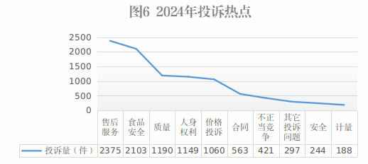 全市2024年投诉热点依然集中在售后服务、食品安全、质量、人身权利、价格投诉等方面。
