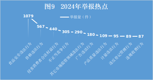 (二)举报问题:举报热点集中在食品安全违法行为、价格违法行为、侵害消费者合法权益等方面。