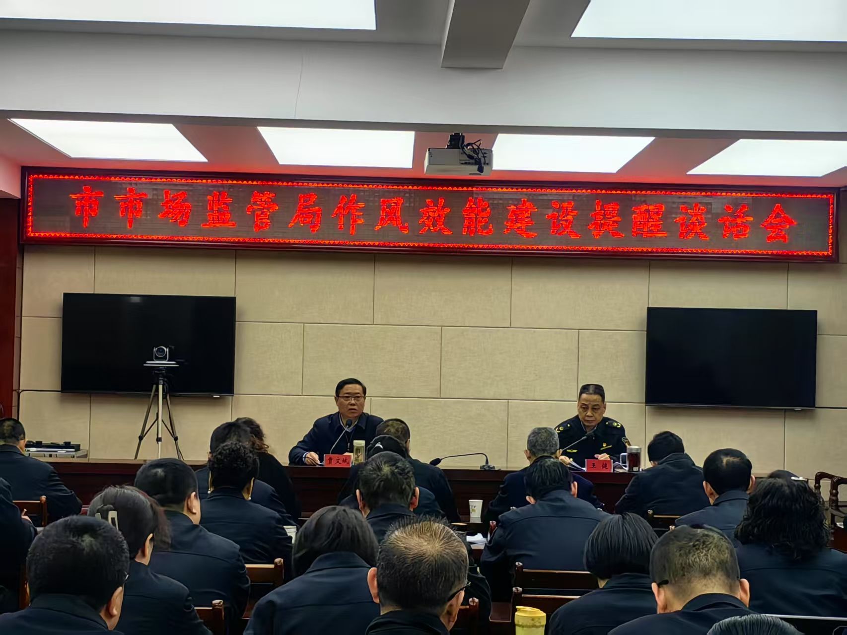为进一步强化市场监管工作人员纪律作风建设,增强干部职工的责任意识与规矩意识,不断提升服务效能和水平,3月31日,天水市市场监督管理局召开作风效能建设提醒谈话会。党组成员、副局长贾文斌主持会议并讲话,局机关全体干部职工和局属单位分管领导参加会议。