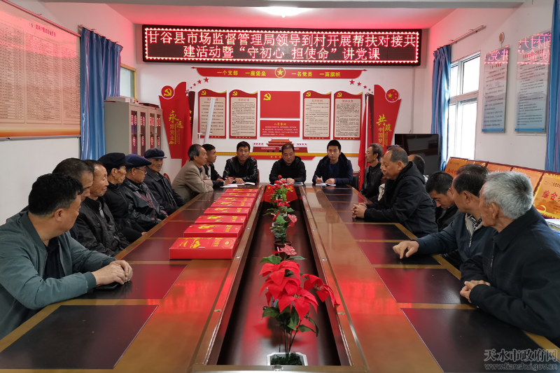 10月13日,甘谷县市场监管局组织开展帮扶对接共建暨“守初心、担使命”讲党课活动,县局分管领导带队赴盘安镇十甲坪村、毛河村开展帮扶对接共建、讲授党课,并与帮扶村党员进行了座谈联谊。