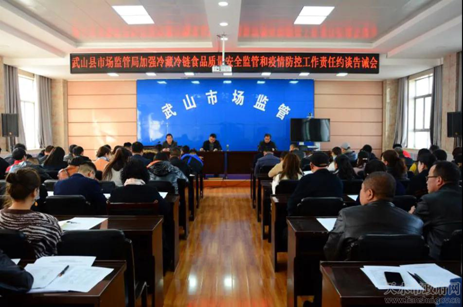 为进一步落实冷链食品安全监管和疫情防控工作,11月18日,武山县市场监管局召开了加强冷藏冷链食品质量安全监管和疫情防控责任约谈会,全县大型餐饮服务单位、商场超市、冷藏冷冻库等食品经营单位负责人共90余人参加了约谈。