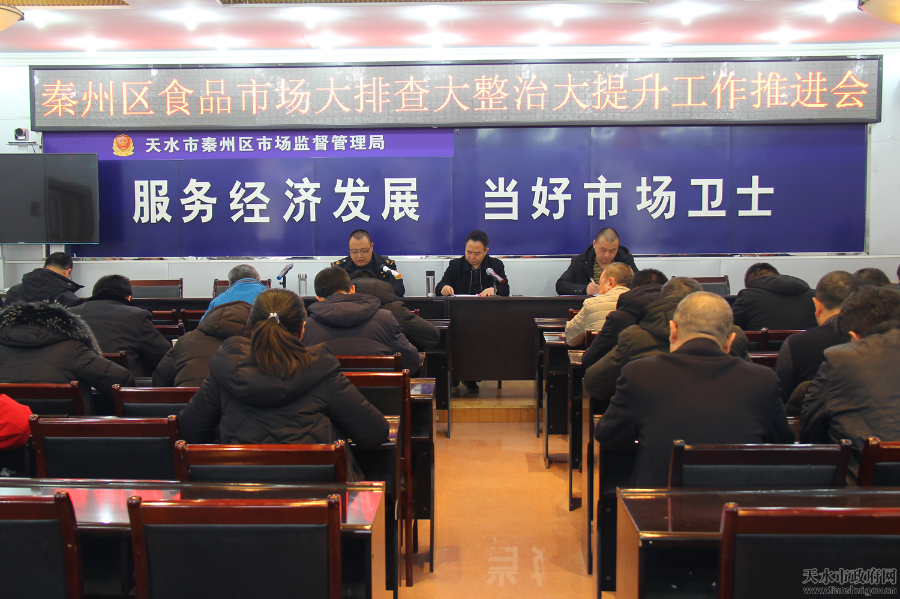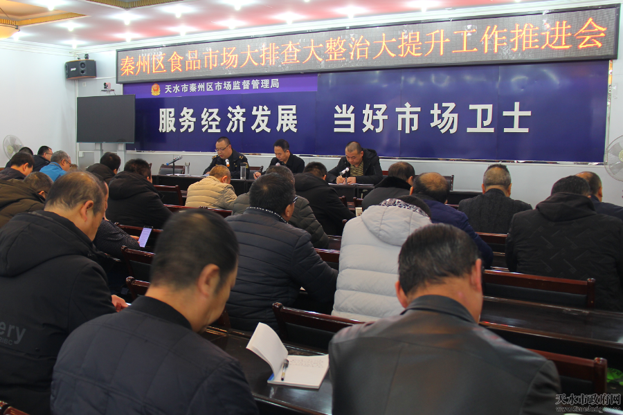 为确保食品市场大排查大整治大提升专项行动取得实效,不断提升辖区食品安全水平,12月4日,秦州区市场监管局召开食品市场大排查大整治大提升工作推进会。局班子成员、各市场监管所负责人、机关股室负责人等60余人参加会议。
