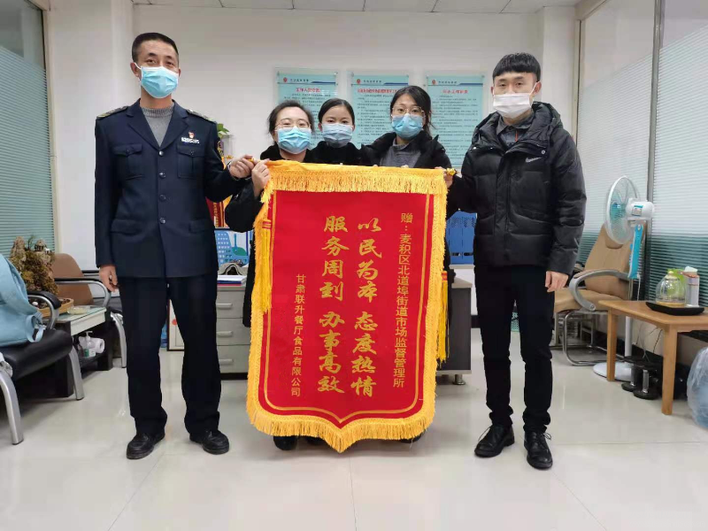 近日,甘肃联升餐厅食品有限公司将一面印有“以民为本、态度热情、服务周到、办事高效”的锦旗送到麦积区市场监督管理局北道埠街道市场监督管理所,向工作人员表达真心的谢意。