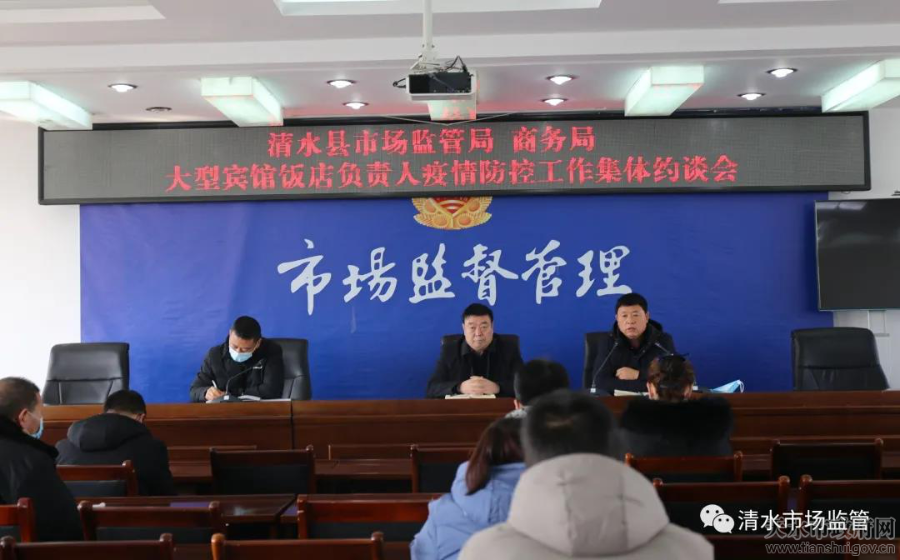 1月19日,清水县市场监管局联合县商务局、永清镇政府召开大型宾馆饭店疫情防控工作集体约谈会,集中约谈城区在营宾馆饭店负责人,安排部署疫情防控工作。会议由县市场监管局党组书记、局长何宝平主持,县商务局局长吴全玉、永清镇副镇长巨鹏举参会并讲话,永清镇四个社区书记、城区18家大型宾馆饭店负责人和相关监管辖区执法人员参加会议。