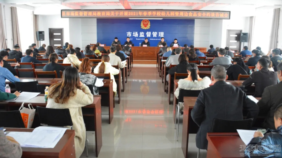 为切实加强春季学校幼儿园及校园周边食品安全监管,落实新冠肺炎疫情防控措施,严防食源性疾病发生,保障广大师生身体健康和生命安全,3月5日,甘谷县市场监管局联合县教育局召开了2021年学校幼儿园及校园周边食品安全约谈告诫会。县市场监管局、县教育局领导、各乡镇市场监管所负责人、学校代表、食堂负责人、食品监管人员共计100余人参加会议。