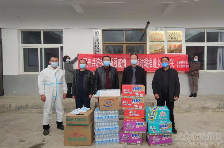 在防疫物资和生活用品极其困难的情况下,想方设法筹措防疫资金,联系清水县家乐商贸有限公司等爱心企业,为郭川镇马蹄等6村采购方便面18件(1件12桶)、矿泉水12件(1件24瓶)、医用口罩1000只、防护服12套、护目镜12副。为驻村一线的工作队员和乡亲们送去了冬天里的温暖。