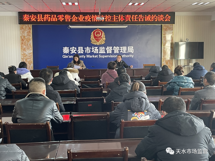 1月12日,秦安县市场监督管理局组织召开全县药品零售企业疫情防控主体责任告诫约谈会,进一步提升辖区药品零售企业思想认识,压实疫情防控主体责任,筑牢零售药店疫情防控屏障。辖区120余家药品零售企业负责人参加会议。