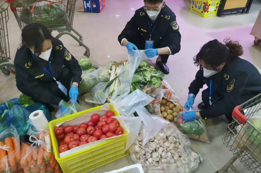 中城市场监管所在加大疫情防控市场监管工作的同时,按照区疫情联防联控领导小组疫情防控期间工作安排,担负起辖区封控区人民群众的生活物资保障工作。全所执法人员积极关注封控区居民的合理诉求,及时掌握困难和需求,开展“点对点”信息收集,从封控区居民的“菜篮子”、“米袋子”和“药罐子”入手,全力做好保障服务。封控点工作人员将每天统计的所需生活物资及用药需求汇总给监管所工作人员,监管所人员第一时间对接超市、保供药店,帮助超市分装蔬菜包,装卸物资,全程服务,全程监管,并将物资按需及时送至居民手中,做到“点对点”精准服务。