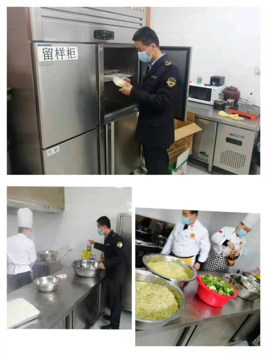 平南监管所严格落实疫情防控工作职责,对辖区指定保供单位实行轮流蹲守,督促其严格落实疫情防控措施。对平南镇隔离医学观察点临时供餐食堂食品安全高度重视,安排专人蹲点进驻,专门负责该临时供餐食堂的食品安全。对该食堂每餐食品的食材来源、烹饪加工过程、食品留样、餐饮具清洗消毒、加工场所卫生环境清洁、餐厨废弃物后处理等方面进行严格检查,最大程度降低食品安全风险,为隔离医学观察人员、医护人员等提供了安全放心的餐食。