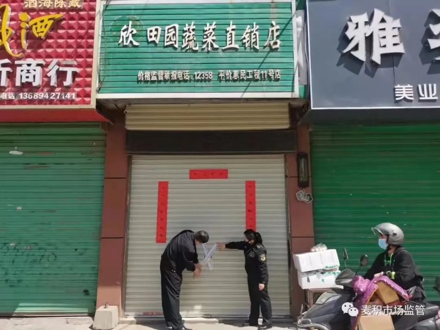 另一家是辖区欣田园蔬菜直销店,执法人员检查发现其无经营场所消杀记录,虚设测温登记台,未要求进出人员扫码测温登记,店内部分商品未明码标价,依法责令其立即关门停业整顿。麦积区市场监督管理局要求以上两家关停单位整改完成后向辖区市场监管所提交整改情况报告,经执法人员现场验收合格,确保经营门店切实消除疫情防控隐患后方可正常营业。
