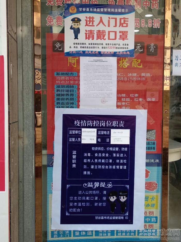 甘谷县局近期还统一制作了“进入门店 请戴口罩”的温馨提示贴纸和“疫情防控岗位职责”贴纸,公布了经营门店的监管单位、监管人员、监管职责、监督电话等内容,由执法人员在巡查过程中,及时张贴在经营场所门口醒目位置,提醒广大消费者进入公共场所主动佩戴口罩、接受体温检测。