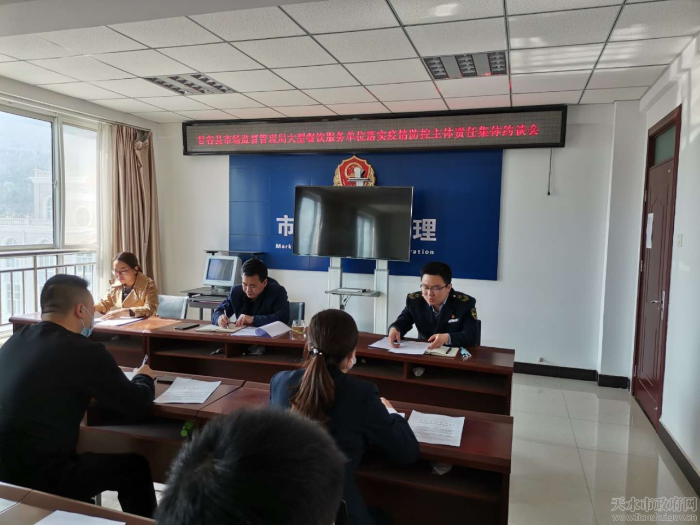 近日,甘谷县市场监督管理局组织召开全县大型餐饮服务单位落实疫情防控主体责任集体约谈会议。对大型餐饮单位复工营业、疫情防控和食品安全工作做了全面安排部署 。