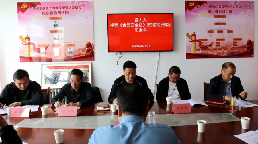 4月18日,清水县人大常委会副主任蔡友平带领县人大常委会检查组,对全县《食品安全法》宣传贯彻落实情况进行了检查。清水县市场监管局党组书记、局长金海杰陪同检查并做工作汇报。