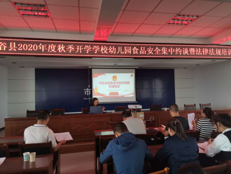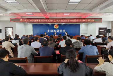 为切实加强学校幼儿园及校园周边食品安全监管,落实疫情防控措施,靠实校(园)长的第一责任人责任,甘谷县市场监督管理局联合县教育局,组织开展了2020年秋季开学学校幼儿园食品安全集中约谈暨法律法规培训。全县81家开办食堂的学校幼儿园负责人及食品安全管理员参加了会议。