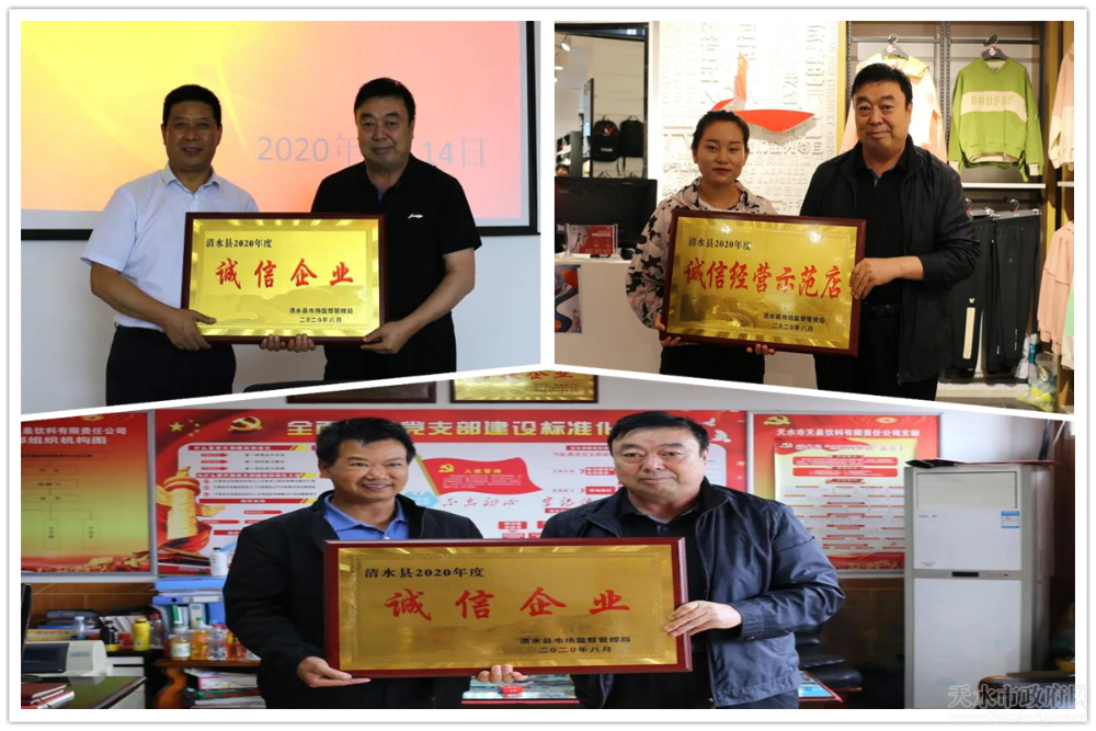 为进一步推动社会信用体系建设,引导广大经营者提高诚信经营意识、树立诚信文化理念、弘扬诚信传统美德,营造良好市场环境,近日,清水县市场监管局负责人带队,为诚信经营单位评选活动中评选出来的经营规范、信誉度高、消费者普遍认可的清水天嘉公交旅游实业有限公司、天水中海建设工程有限公司、清水县金水源大酒店有限责任公司第一分公司等22家企业和6家个体工商户授予了2020年度“诚信企业”、“诚信经营示范店”称号牌匾。