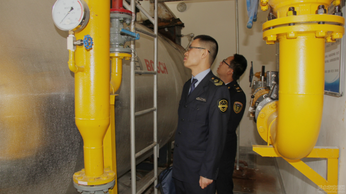 此次检查,一方面针对使用单位安全管理情况。包括使用单位安全管理机构、安全管理人员持证情况,安全管理制度和岗位责任制度落实,事故应急专项预案及演练记录,锅炉使用登记证、定期检验报告及安全管理人员和作业人员上岗情况。另一方面针对检查锅炉使用情况,包括检查设备液位(面)计是否有最高、最低安全液位标记,安全阀和压力表有效的校验报告或标记,水位、压力是否在允许范围内,检查设备运行记录、水(介)质化验记录和定期水质化验报告。检查同时,执法人员向企业负责人进行了相关法律法规讲解和宣传,对检查中发现问题的企业,执法人员现场下达《特种设备安全监察指令书》,责令限期整改。