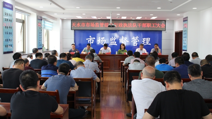 6月25日,市市场监管综合行政执法队召开干部职工大会,总结了机构改革以来工作开展情况和面临的问题,提出了下一步工作总体思路,并对近期重点工作进行了安排部署。会议宣读了队领导任命文件,通报学习了《中共天水市委办公室天水市人民政府办公室<关于印发天水市深化市场监管等五大领域综合行政执法改革的实施方案>的通知》,并对精准扶贫驻村帮扶工作调整情况进行了宣布。队长余金龙出席会议并讲话,副队长刘晓峰主持会议,队领导班子成员、全体干部职工80余人参加会议。
