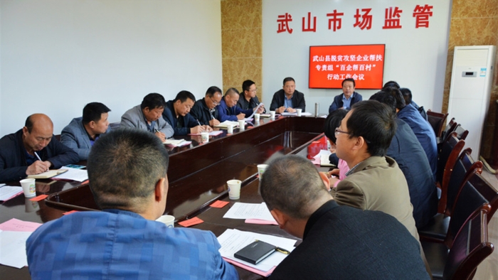 一是强化组织领导,靠实工作责任。按照县委、县政府关于脱贫攻坚的总体部署,武山县市场监管局充分发挥“百企帮百村”脱贫攻坚行动领导小组办公室的牵头协调作用,积极协调组织筹备召开了武山县“百企帮百村”脱贫攻坚行动领导小组成员单位工作会议,制定并印发了《武山县2019年“百企帮百村”脱贫攻坚行动实施方案》,对“百企帮百村”脱贫攻坚工作进行了全面安排部署。整个行动过程中,各职能部门紧盯帮扶方案步骤,按各自职责分工有序推进组织动员工作。