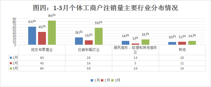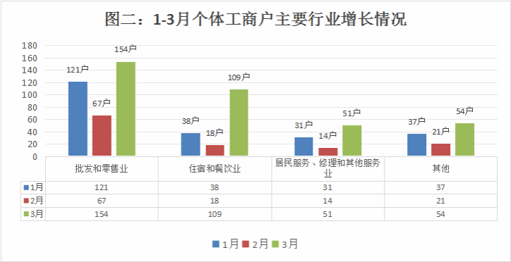 从行业类型看,第一季度个体工商户增量位居前三的行业分别是批发和零售业(342户)、住宿和餐饮业(165户)、居民服务、修理和其他服务业(96户)。进入3月后,住宿和餐饮业增速显著,为1月新增的2.87倍;居民服务、修理和其他服务业次之,为1.65倍,其他为1.46倍,批发和零售业为1.27倍。