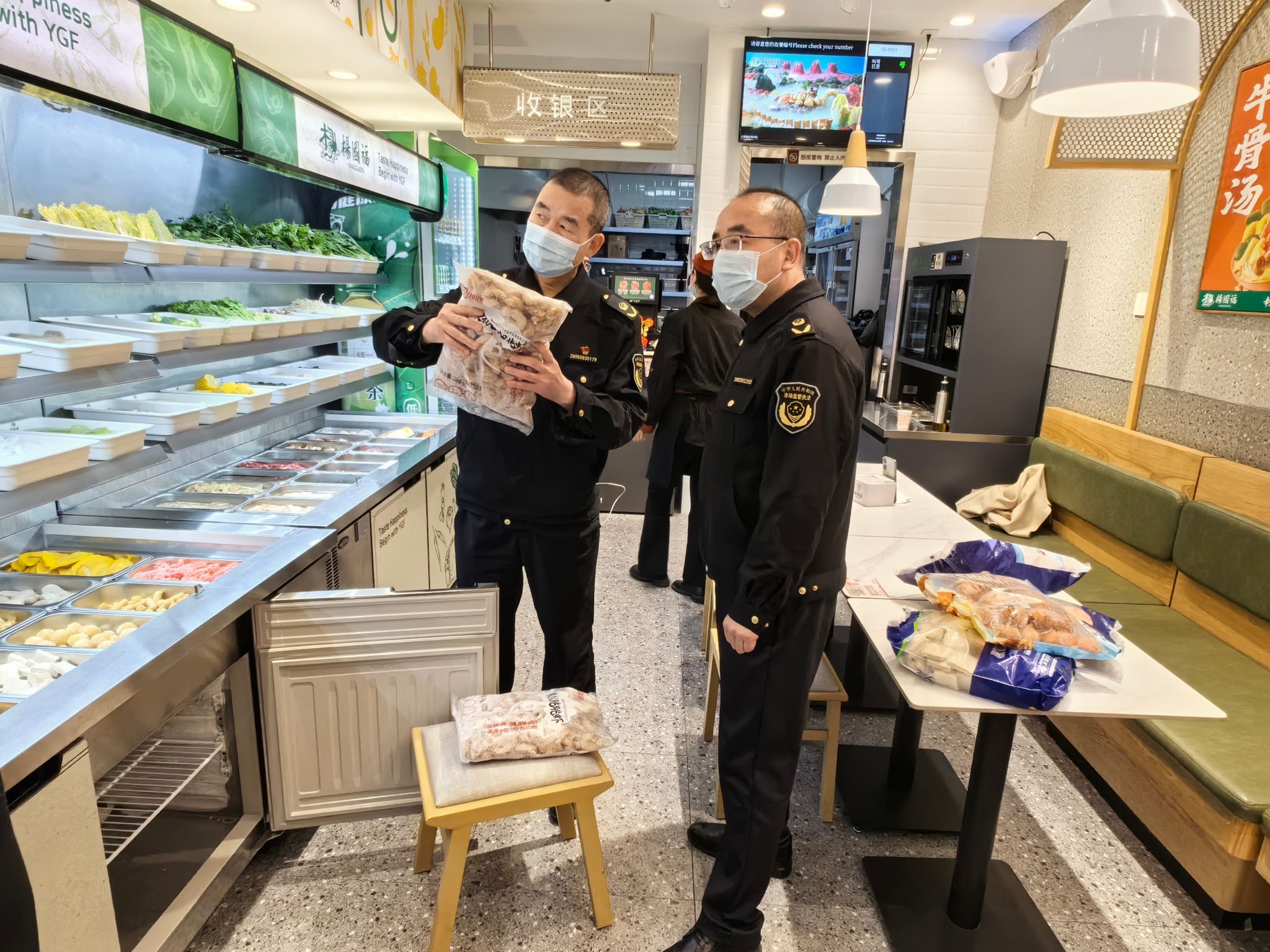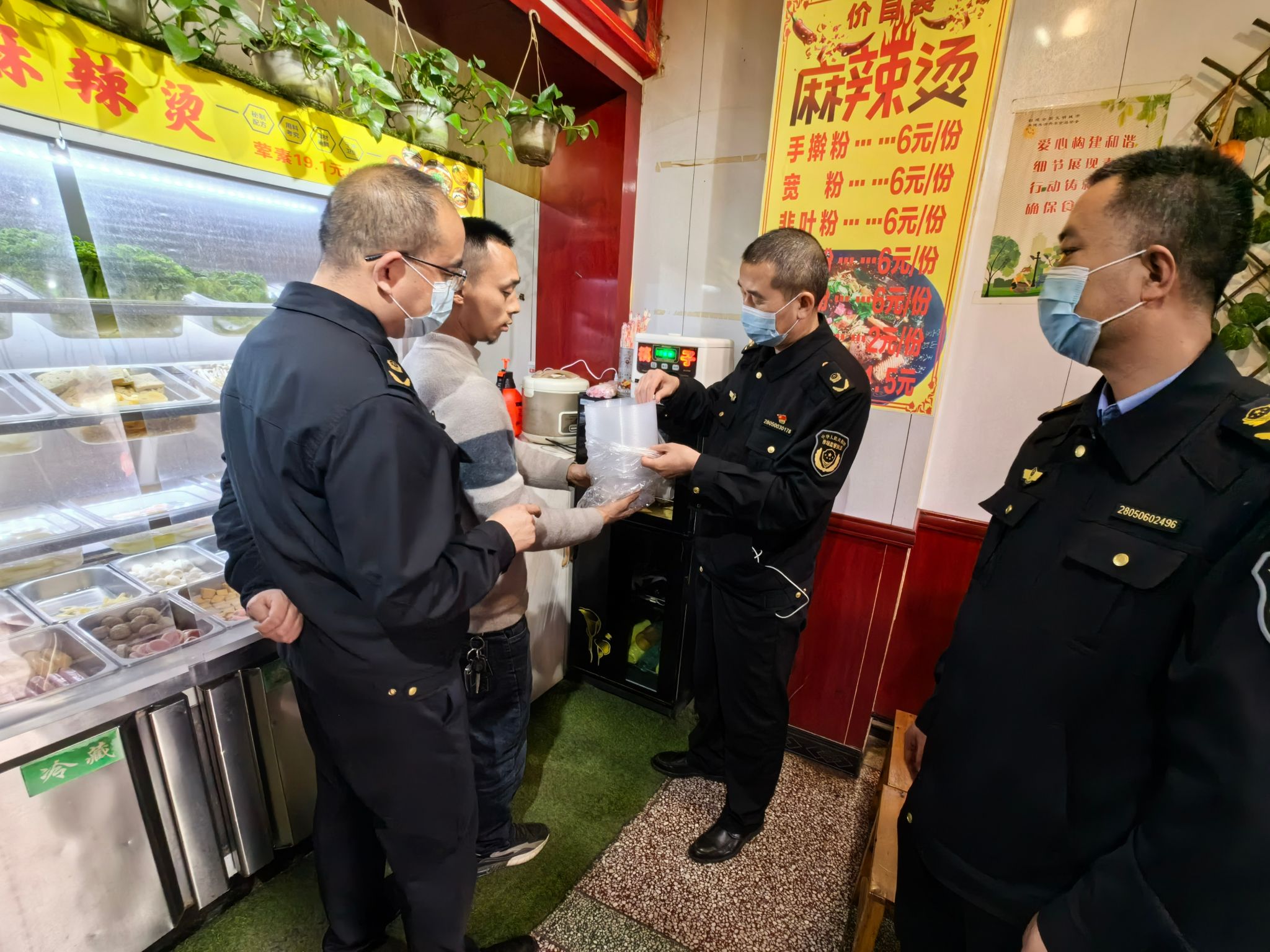 执法人员重点围绕从业人员健康管理、食品原材料控制、加工制作流程、食品留样、餐饮具清洗消毒、场所和设备设施清洁维护等环节进行了规范指导,检查麻辣烫从业人员“一穿(白大褂)”“三戴(戴帽子、口罩、手套)”“三有(明码标价牌、食品小摊点登记卡、从业人员健康证)”落实情况;同时要求从业人员统一使用一次性餐盒或消毒碗筷。经过检查指导,全县麻辣烫经营主体在原料采购、从业人员工作衣帽、加工制作、环境卫生、液化气瓶及灶具使用等环节得到了有效提升,麻辣烫市场经营秩序稳定有序。